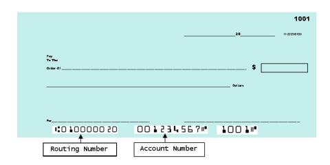 Before you fill out the form, be sure you know your bank’s routing number and your account number. If you have a checking account, this information can be found on the bottom of a check (see image).